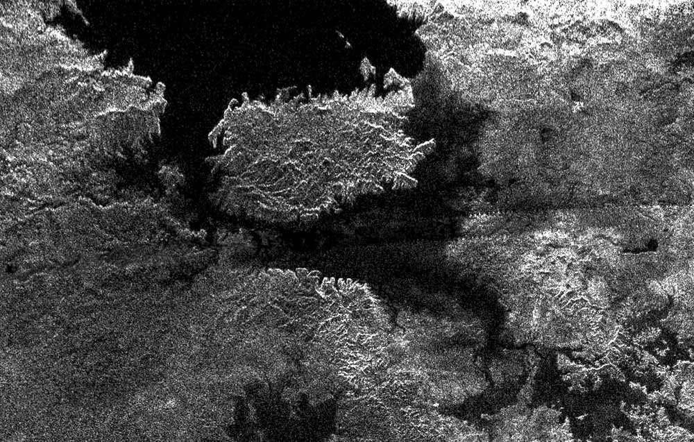 Das Radarbild, aufgenommen bei einem polnahen Vorbeiflug am 22.2.2007, zeigt ein inselähnliches Gebilde mit einem der größeren “Seen” auf dem Saturnmond Titan. die Insel mißt ungefährt 90 x 150 Kilometer - ist also fast so groß, wie die große Insel von Hawaii. Es kann sich bei dieser Insel auch um eine Halbinsel handeln, die über eine brückenähnliche Landzunge mit dem Festland verbunden ist. Weiter unten auf dem Bild sind mehrere kleine Seen zu erkennen.