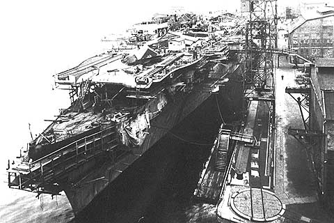 Nach dem japanischen Angriff auf Pearl Harbour stand es außer Frage, daß ein Flugzeugträger unbedingt erforderlich war. Der Befehl zum Weiterbau erging am 13. Mai 1942. Die Fertigstellung des Schiffes sollte forciert werden und bis zum Sommer 1943 abgeschlossen sein. Die Flugzeuge die der Träger in Zukunft tragen sollte ware auch bereits entwickelt oder umgebaut.