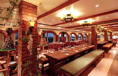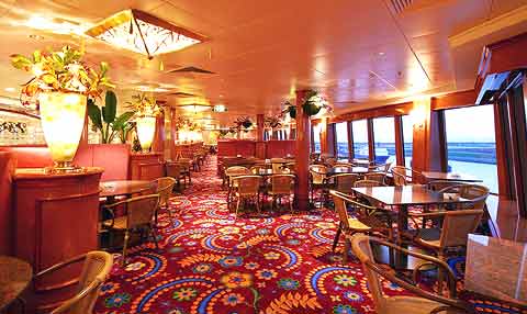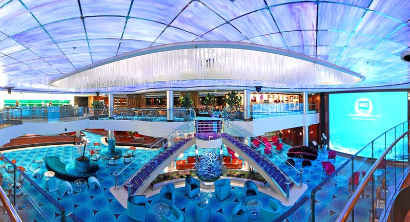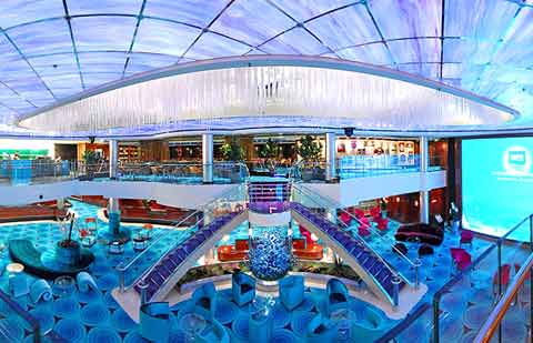 Crystal Atrium and Java Café (Deck 7 – 8) Das Zentrum des Schiffes. Das erste Rendezvous des Passagiers mit dem Ozeanriesen findet hier an der Rezeption statt. Im Java Café auf Deck 7 werden die erlesensten Kaffeesorten serviert. Zudem gibt es mit dem Port O’ Call Shop die Möglichkeit Kleinigkeiten einzukaufen und im gegenüberliegenden Reisebüro „Shore Excursion“ Tagesausflüge zu buchen. Auf einer großen LED-Videowand auf Deck 8 werden die neuesten Ereignisse und Vorführungen präsentiert. In den weiteren Bereichen auf Deck 8 bietet die Reederei den Passagieren über 24 Stunden täglich Snacks und andere kulinarische Köstlichkeiten. Der Salsa/Texmex-Bereich auf der Steuerbord-Seite unterscheidet sich dabei vom Raumdesign des Coffee Shop-Bereiches auf der Backbord-Seite. Die Eiszapfendecke auf Deck 8 rundet das Ambiente dieses Raumes ab.