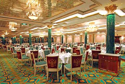 Die Restaurants der Norwegian Pearl: Das Schiff verfügt über 2 Hauptrestaurants. Das INDIGO - Deck 6- ist das kleinere der beiden Restaurants und bietet über 300 Passagieren Platz. Das SUMMER PALACE -ebenfalls auf Deck 6- bietet mehr als 600 Passagieren Platz. Das Design des Hauptrestaurants erinnert an einen großen russischen Zarenpalast. Der besondere Reiz dieses Restaurants wird durch die vollflächige Heckfensterkonstruktion unterstützt. Besonders erwähnenswert ist jedoch auch die aufwendig verarbeitete Haupttreppe am zentralen Eingang des Raumes. Meisterköche bereiten kunstvolle 6-Gänge-Menüs.