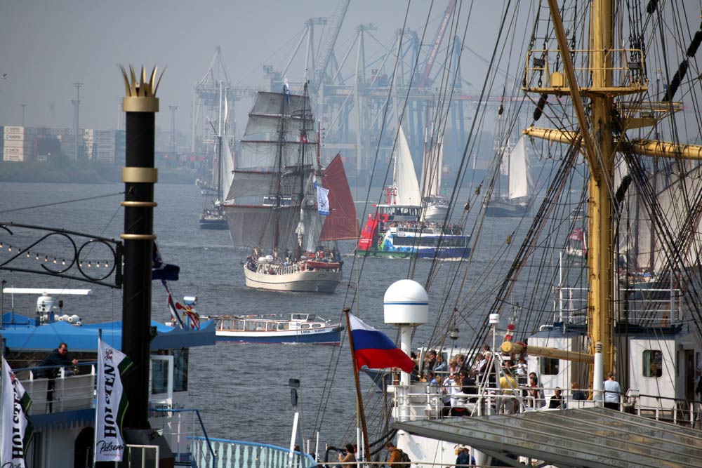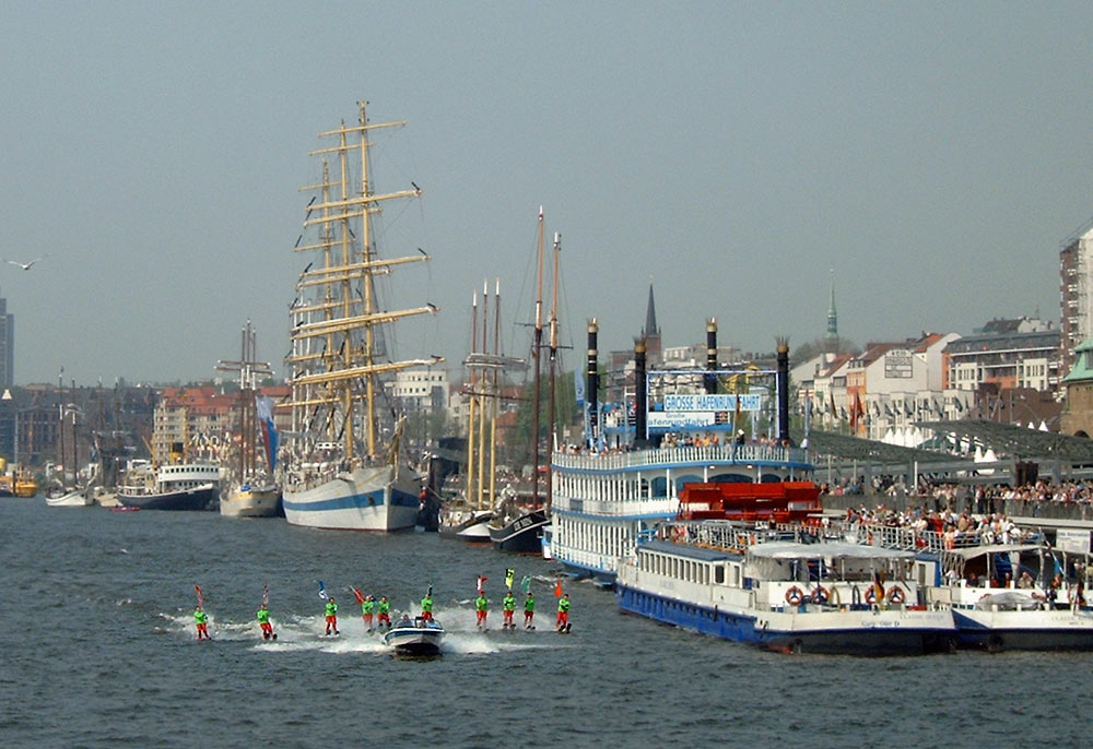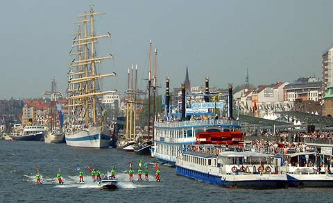 Dicht an dicht drängen sich die Schiffe an den mehr als 800 Meter langen Landungsbrücken, darunter des größte Segelschiff der Welt, die russische MIR. Im Vordergrund eine Parade des Hamburger Wasserskiclubs