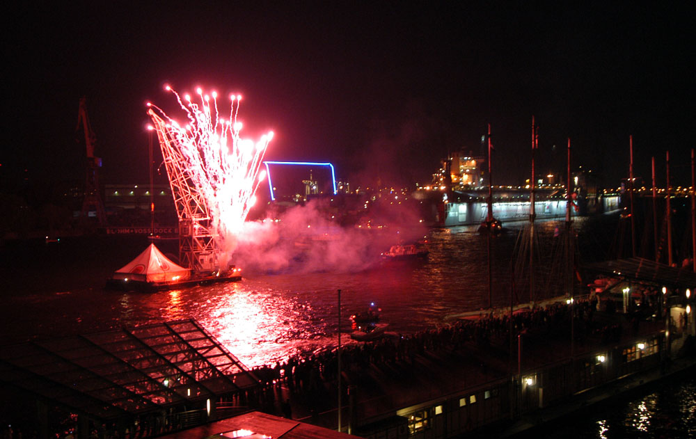 6.Mai 24 Uhr: Feuerwerk vom Schwimmkran aus vor den Landungsbrücken. Foto: HMC/ Nico Maack