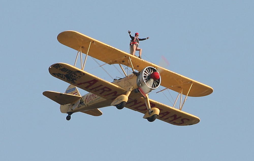 Zwischem laufendem und stehendem Gut der Takelage der MARE FRISIUM erscheint der Doppeldecker Boeing PT 17 Stearman mit der Flugakrobatin Peggy Krainz - stehend auf dem Oberdeck