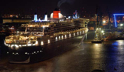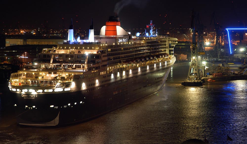 Gegen 23 Uhr dockt die QUEEN MARY 2 in Dock 17 bei Blohm+Voss ein. Foto:HMC/ Nico Maack