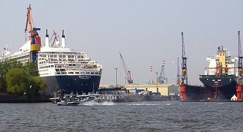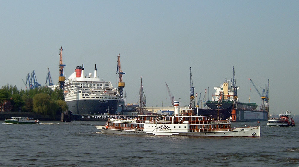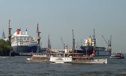 Der Raddampfer FREYA vor der eingedockten QUEEN MARY 2