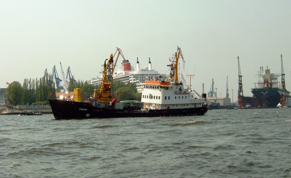 Blick durch das Auge in der Bordwand am Heck des Tonnenlegers FORCE auf die QUEEN MARY 2