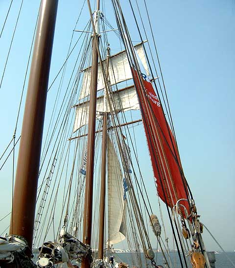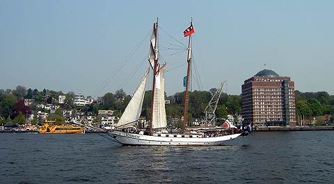 Bei sommerlichem Wetter und einer leichten Brise unter Segel die Elbe hinab