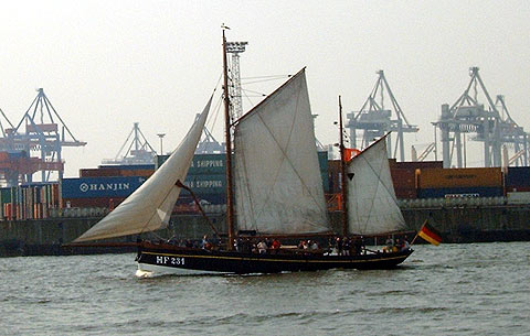 Der Finkenwerder Kutter HF 231 vor dem Containerterminal Altenwerder