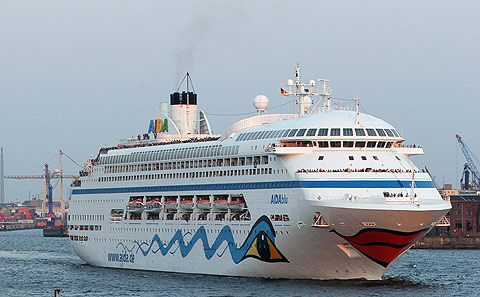Das Kreuzfahrtschiff AIDAblu verläßt Hamburg am frühen Morgen des 6. Mai Foto: HMC/ Nico Maack