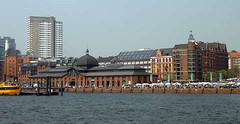 Wenige Stunden später am frühen Sonntagmorgen gegen 7 Uhr: der traditionelle Hamburger Fischmarkt mit der Fischauktionshalle