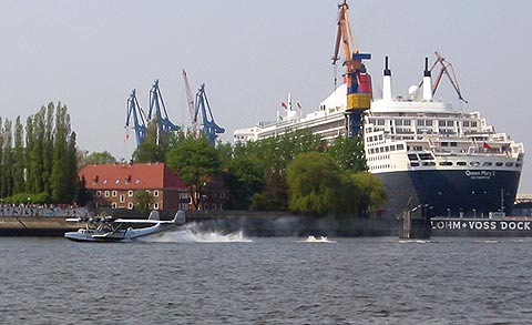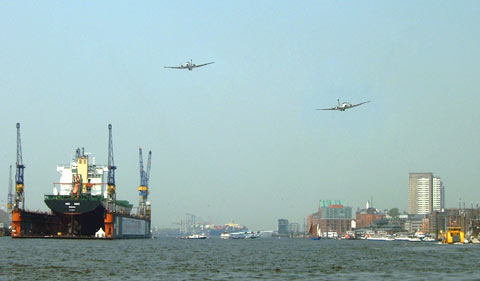 Die Boeing passiert die CAP SAN DIEGO und RICKMER RICKMERS. Im Hintergrund die JU 52 der Lufthansa