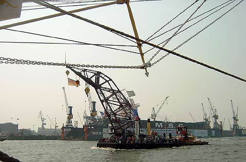 Unter dem Bugspriet der MIR: Der Dampfschwimmkran aus dem Museumshafen Hamburg-Oevelgönne als Ausflugsschiff