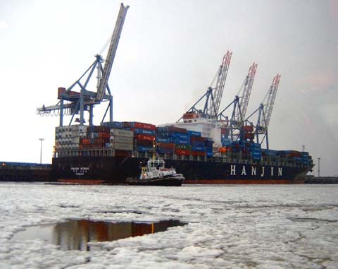 ▲ Der Containerfrachter HANJIN ATHENS legt mit Schlepperhilfe zur Fahrt nach Vigo ab.