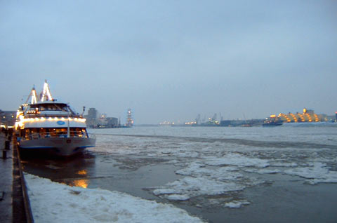 ▲ Das Ausflugsboot LOUISIANA STAR ist ablegebereit zur nächsten Hafenrundfahrt. Der starke Eisgang ist kein Problem für den “Raddampfer”.