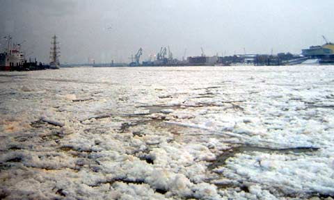 ▲ Eisgang auf der Elbe im Hamburger Hafen. Links am Bildrand der Museumsfrachter CAP SAN DIEGO
