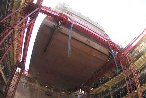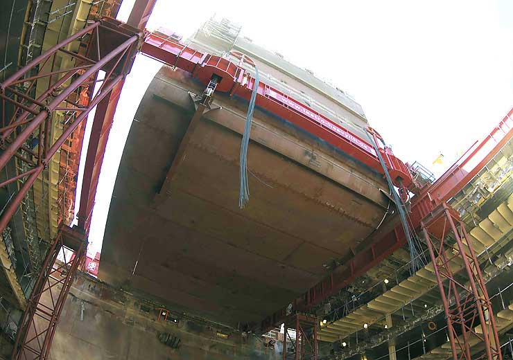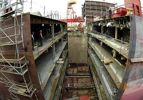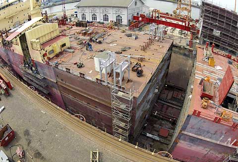 Nur 45 Tage Umbauzeit stehen für jedes Schiff zur Verfügung. Am Trockendock KAISERDOCK I wurde ein Krängungsversuch unternommen, bevor das Schiff im Schwimmdock III verlängert wird. Hier standen bereits zwei der vier neuen Mittelschiffsektionen fertig montiert bereit.