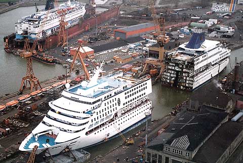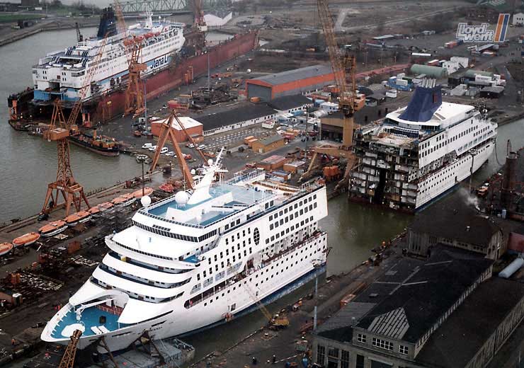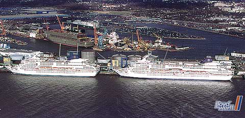 Die von der Lloyd Werft bereits verlängerte "Norwegian Wind" (rechts, ex "Windward") und die noch zu verlängernde "Dreamward" (links, zukünftige "Norwegian Dream") liegen gemeinsam an der Columbuskaje in Bremerhaven. Im Hintergrund ist das Gelände der Lloyd Werft mit dem Rohbau "No. 108" (zukünftige "Norwegian Sky") zu erkennen. 1999