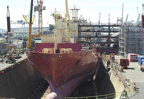 Erschwerend kommt hinzu, daß die Aufenthaltsdauer in der Werft ganz knapp und hart berechnet worden war. Um den Terminplan der Reederei einhalten zu können, werden die Vorarbeiten schon auf der Anfahrt zur Werft und Restarbeiten bei der Rückfahrt ausgeführt. Die Bremerhavener Lloyd Werft hatte den Auftrag zum Umbau der in Neapel beheimaten Schiffe von der Reederei Seatrade Groningen BV. erhalten. Die Schiffe sind 1999 bis 2000 bei der italienischen Werft Fincatieri-Cant. Nav. Italiana SpA in Ancona als Kühlschiffe für Container- und Plattenladungen im Fruchttransport gebaut worden. Die CALA PALMA, CALA PEDRA, CALA PULA und CALA PINO sind baugleich. Alle Schiffe waren bisher 174 m lang und 24 m breit bei einer Tonnage von 13.346 GT.