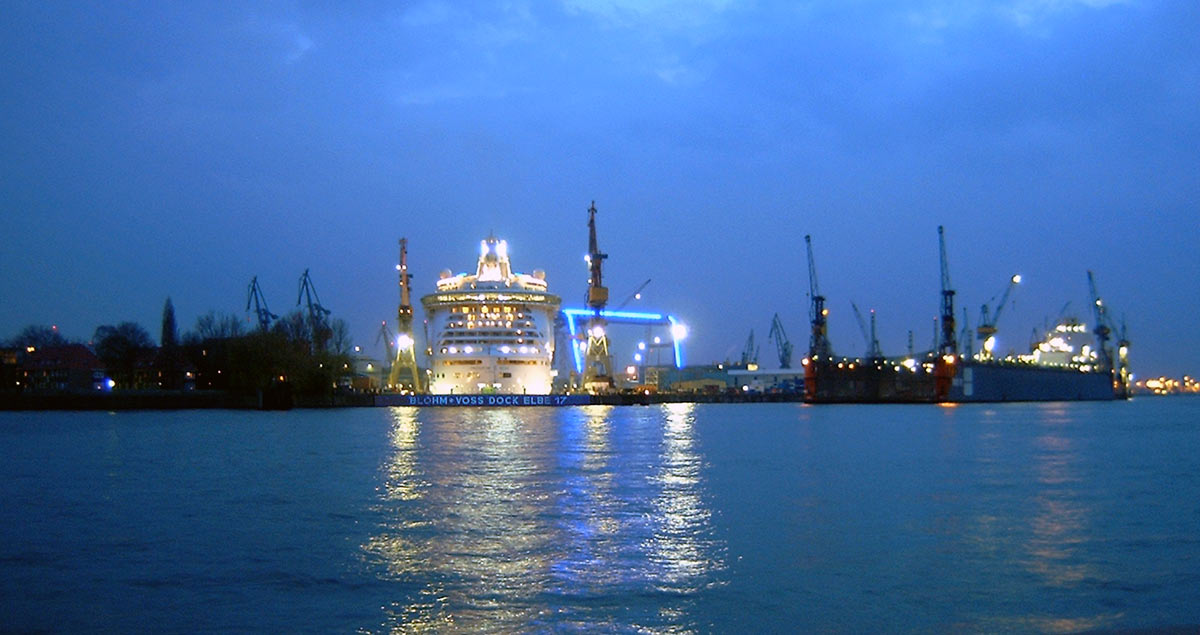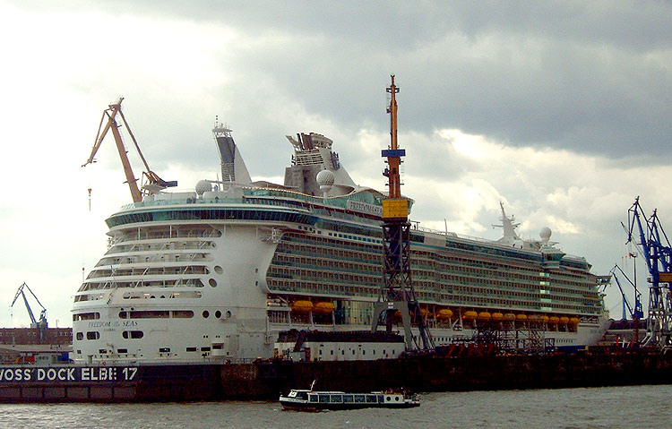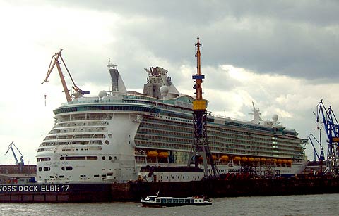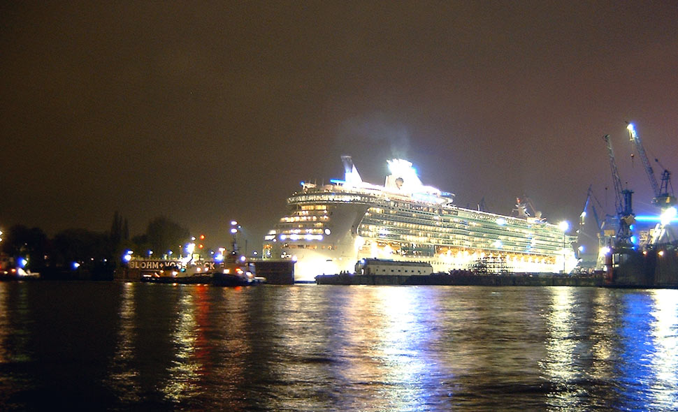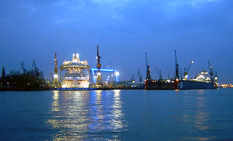▲ Ostermontag, 17.4. 2006, 7.00 Uhr: Soeben eingedockt bei Blohm + Voss. Die Werft hat den Auftrag erhalten, letzte Arbeiten und einige Inspektionen vor der Ablieferung an die Reederei RCCL auszuführen