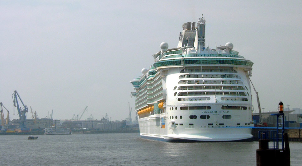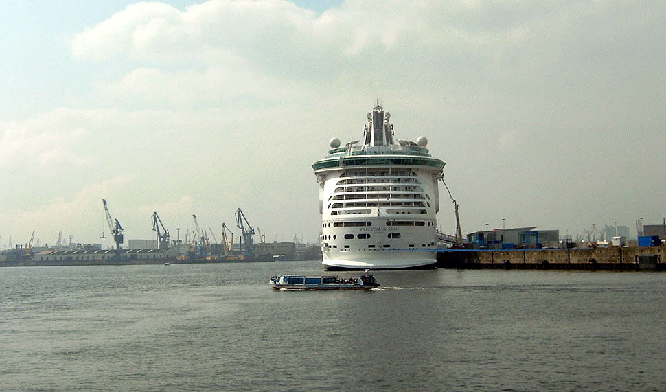 ▲ Quer liegt die FREEDOM OF THE SEAS vor den St.Pauli Landungsbrücken in der hier nur 400 Meter breiten Elbe