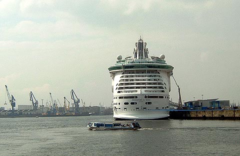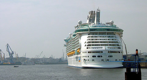 ▲ 23.4.2006, 13.04 Uhr. Nach erfolgreicher Probefahrt ist die FREEDOM OF THE SEAS wieder in Hamburg und hat soeben am Kreuzfahrtterminal Grasbrook festgemacht.