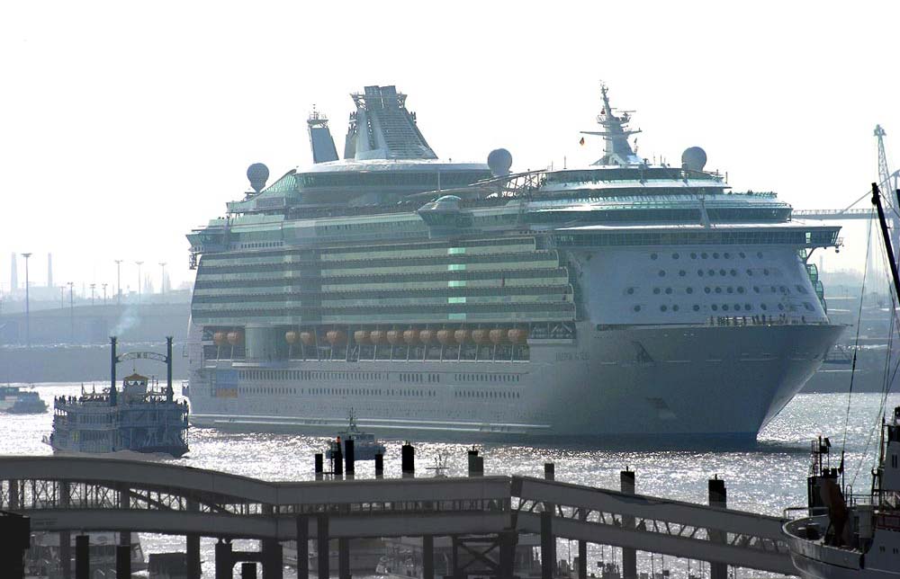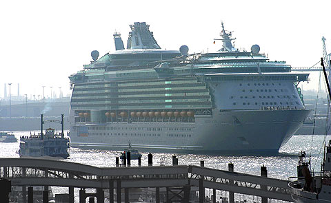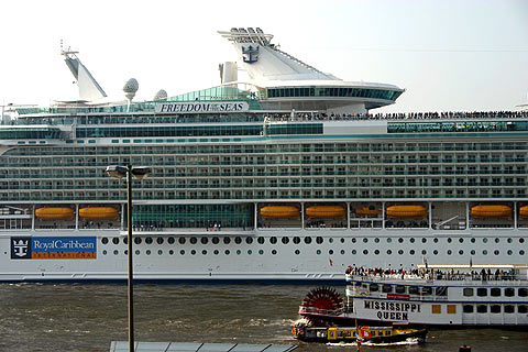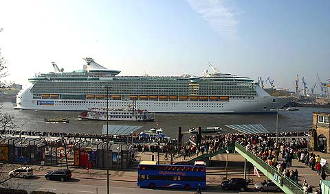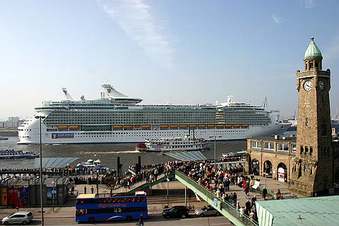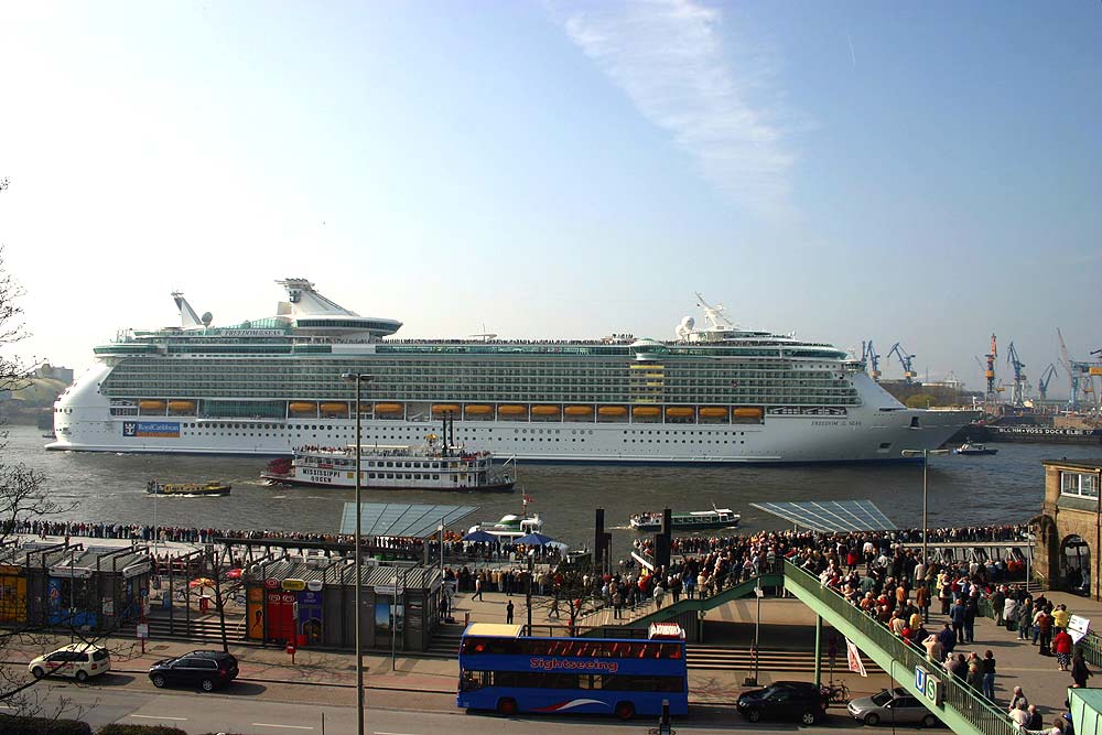 ▲ Die FREEDOM OF THE SEAS vor den St.Pauli Landungsbrücken in der hier nur 400 Meter breiten Elbe