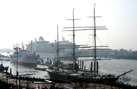 ▲ Dienstag, 25.4. 2006,10.10 Uhr: Die FREEDOM OF THE SEAS passiert die Hamburger Museumsschiffe CAP SAN DIEGO und RICKMER RICKMERS (vorn)