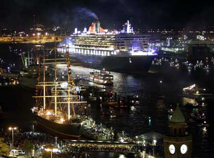 Faszinierend war die Verabschiedung der Queen Mary 2. Kurz vor Mitternacht hieß es "Leinen los". Mit 2620 Passagieren voll ausgebucht und 1253 Besatzungsmitgliedern nahm das Schiff Kurs auf Southampton. Sechs Feuerwerke entlang der Elbe begleiteten das Auslaufen des größten Passagierschiffes der Welt. Die Queen Mary 2 ist ein Luxuslinier der Superlative. Das in Frankreich gebaute Kreuzfahrtschiff ist 345 m lang, 74 m hoch und 45 m breit. Die Baukosten für diesen von Königin Elisabeth II. getauften Ozeanriesen betrugen 870 Millionen Euro.