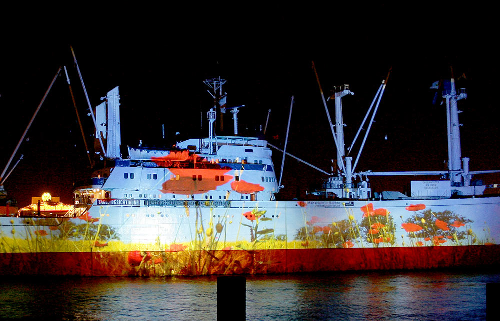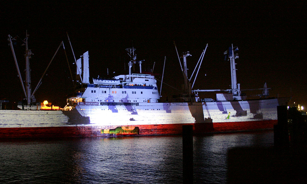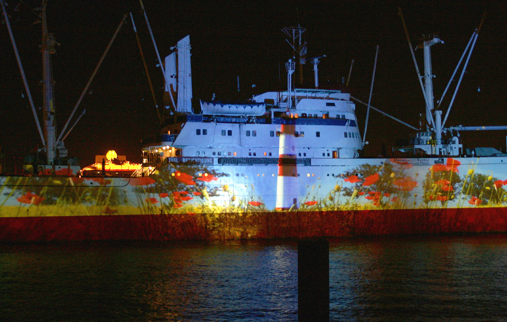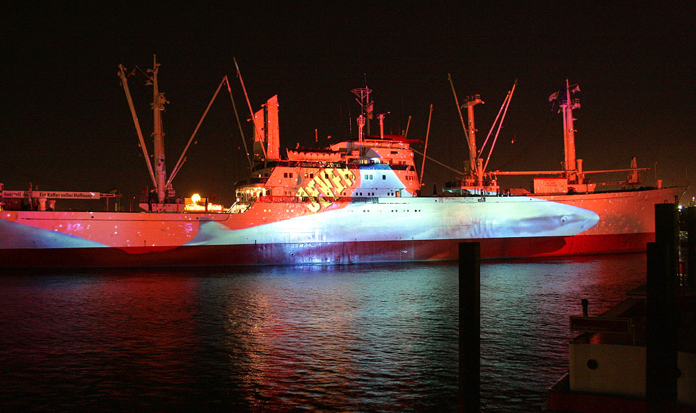 Mit modernster Diaprojektionstechnik werden zwölf unterschiedliche Motive gezeigt. Einige Bilder der eindrucksvollen, typisch nordischen Motive bewegen sich sogar entlang der Außenhülle des Schiffes. Mit Beginn der Dämmerung startet die Show.Das beeindruckendste Motiv auf der Außenhülle der CAP SAN DIEGO ist ein 160 Meter langer Hai.