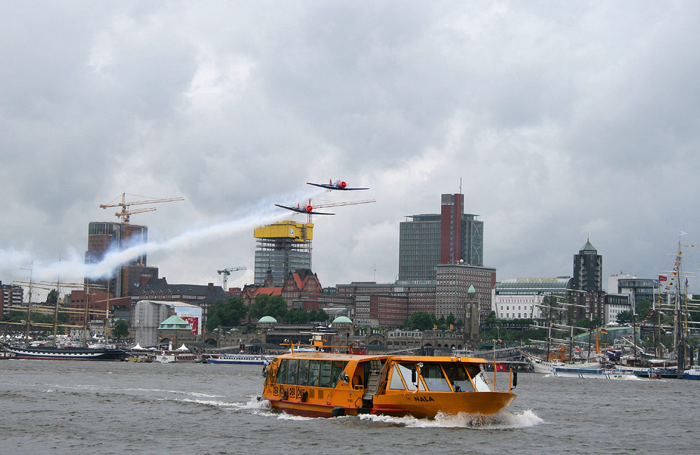 Vater und Sohn Eichhorn mit ihren AT-6 im Tiefflug über der Elbe. Im Vordergrund pendelt die Fähre NALA von den St. Pauli Landungsbrücken zum Musical KÖNIG DER LÖWEN