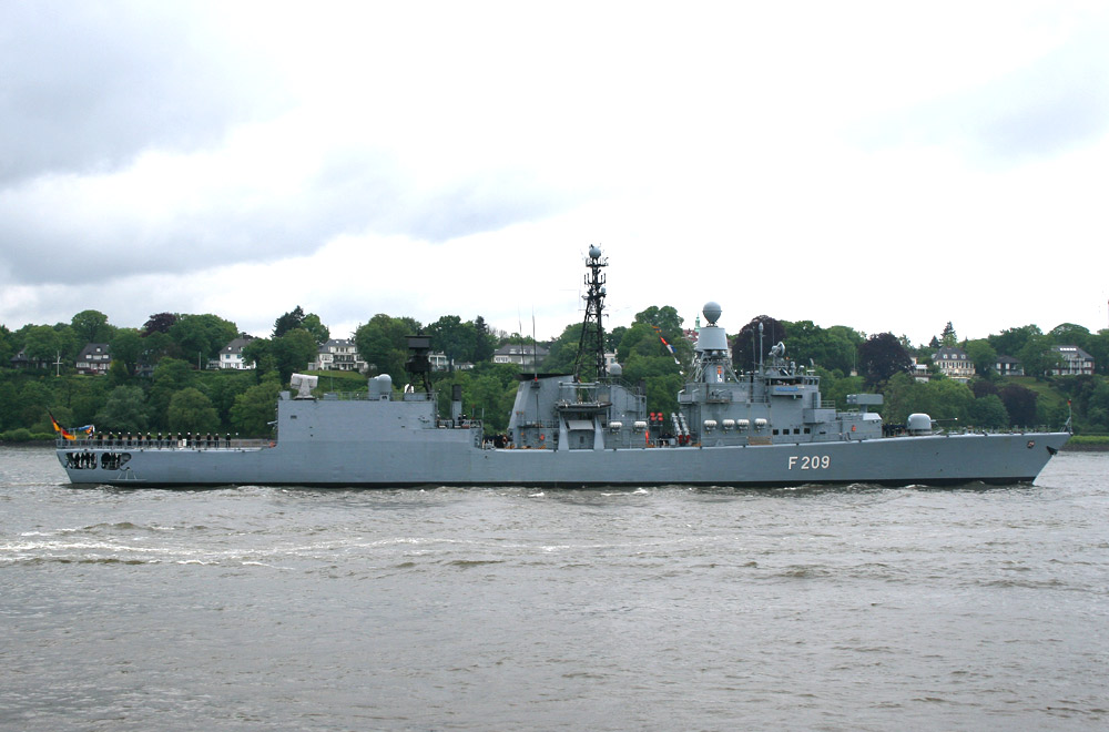 Auf dem Hubschrauberdeck ist die Mannschaft angetreten. Die Fregatte RHEINLAND PFALZ fährt an der Spitze der Einlaufparade