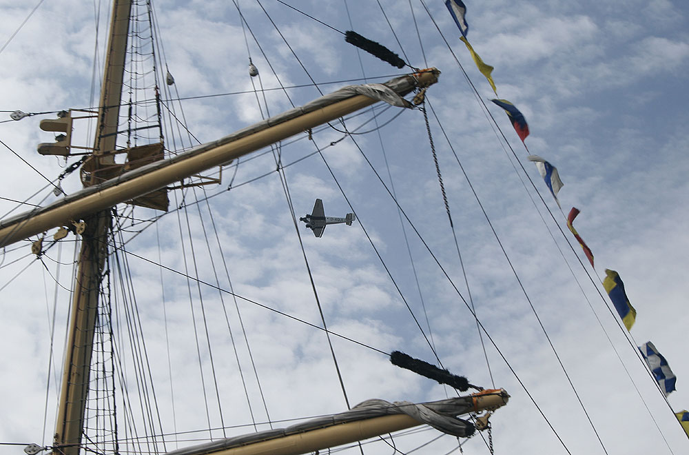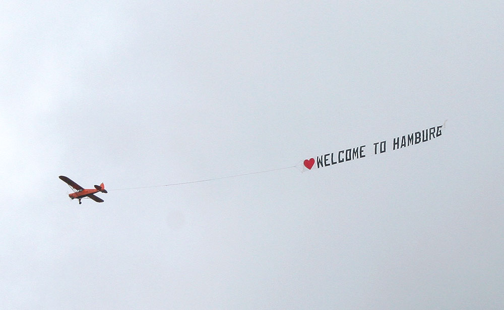 Unerläßlich zog der betagte Hochdecker das Begrüßungsband über dem Hafen