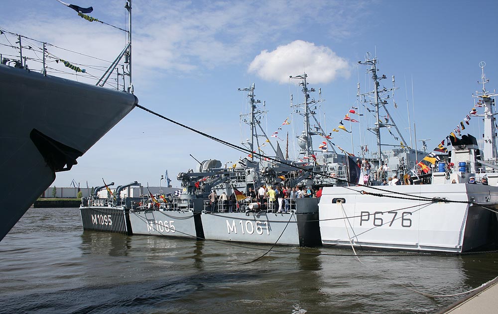 Minenjäger ÜBERHERRN M 1095 und die Minensucher Dillingen M 1065 und Rottweil M 1061. Ganz rechts das französische Fischereischutzboot P 676 FLAMANT aus Cherbourg