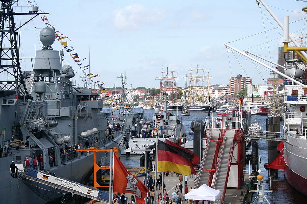 Den Auftakt bildete am Freitagmittag der internationale ökumenische Gottesdienst in der voll besetzten Hauptkirche St. Michaelis (Michel). Mit dem Läuten der Schiffsglocke auf der Rickmer Rickmers durch Michael Glos, eröffnete zum ersten Mal ein Bundeswirtschaftsminister das Hafenfest in der Hansestadt. Danach begann die Einlaufparade - angeführt von der Fregatte RHEINLAND PFALZ der Deutschen Marine.