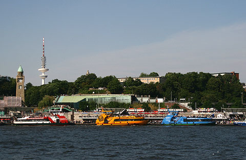 Zentraler Abfahrtsort: Die St. Pauli Landungsbrücken - 2008 - mit Cap San Diego, aber noch ohne Elbphilharmonie