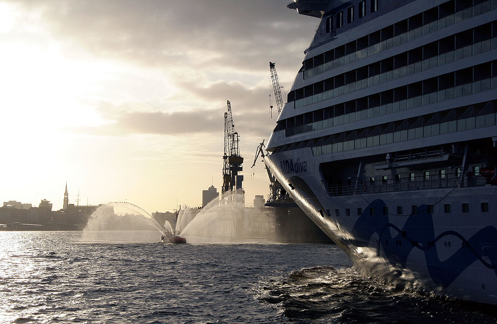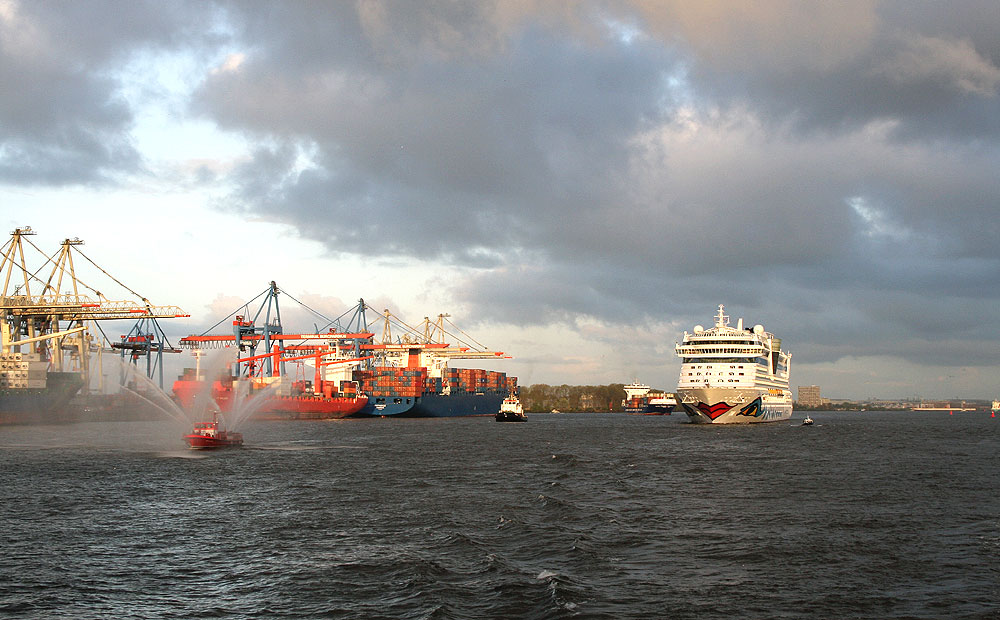 Vor dem Containerterminal Burchardkai wartet ein Löschboot der Hafenfeuerwehr.”Wasser marsch aus allen Rohren”, zur Begrüßung der AIDAdiva