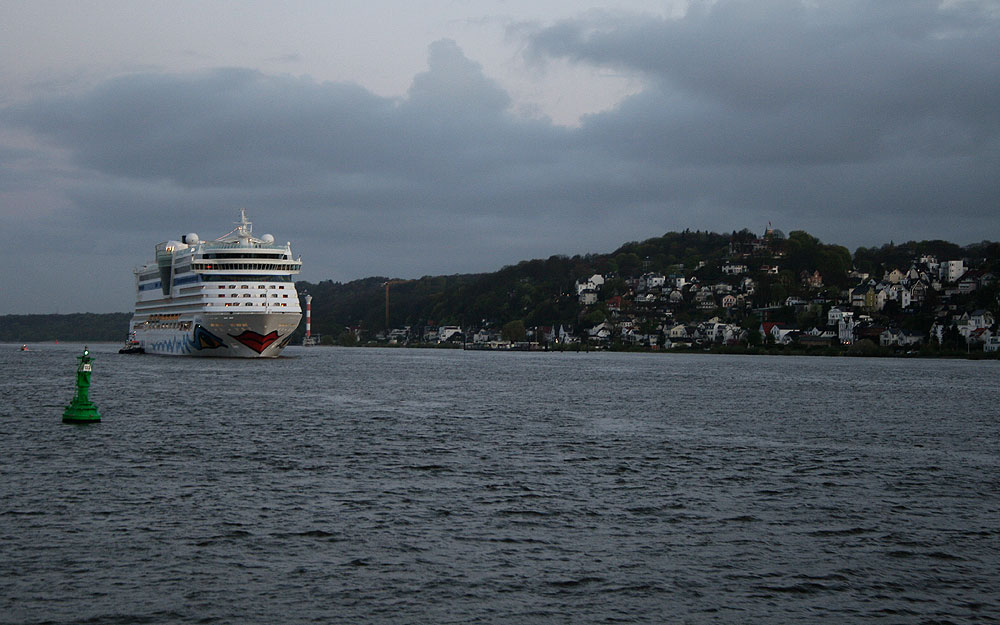 Im ersten Tageslicht bei 5° Celsius und einer recht steifen Brise erreicht die AIDAdiva den Hamburger Stadtteil Blankenese mit dem 87 m hohen Süllberg.