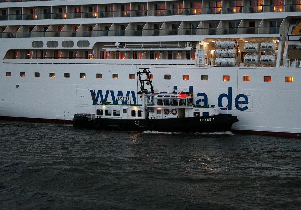 Das Lotsenboot liegt längsseits. Der Elblotse geht von Bord, der Hafenlotse übernimmt das Schiff.