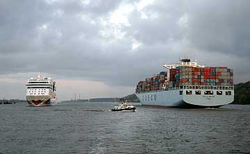 Der Containerfrachter COSCO BEIJING läuft Richting Shanghai aus und begrüßt die AIDAdiva mit dem Schiffshorn. Das Lotsenboot nimmt Kurs auf den Containerriesen.