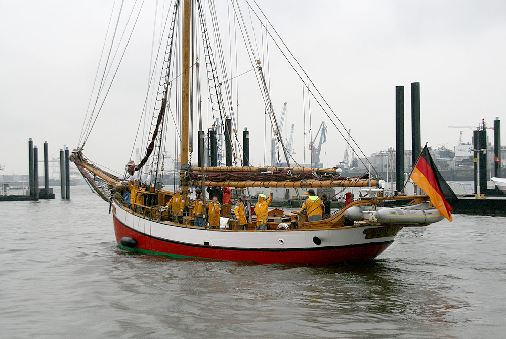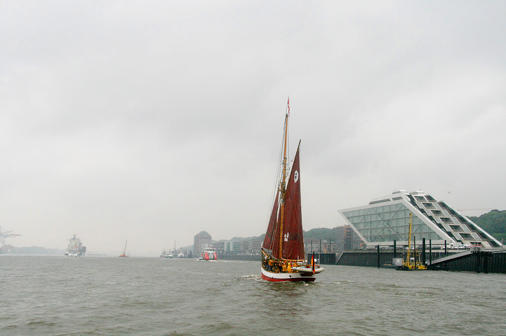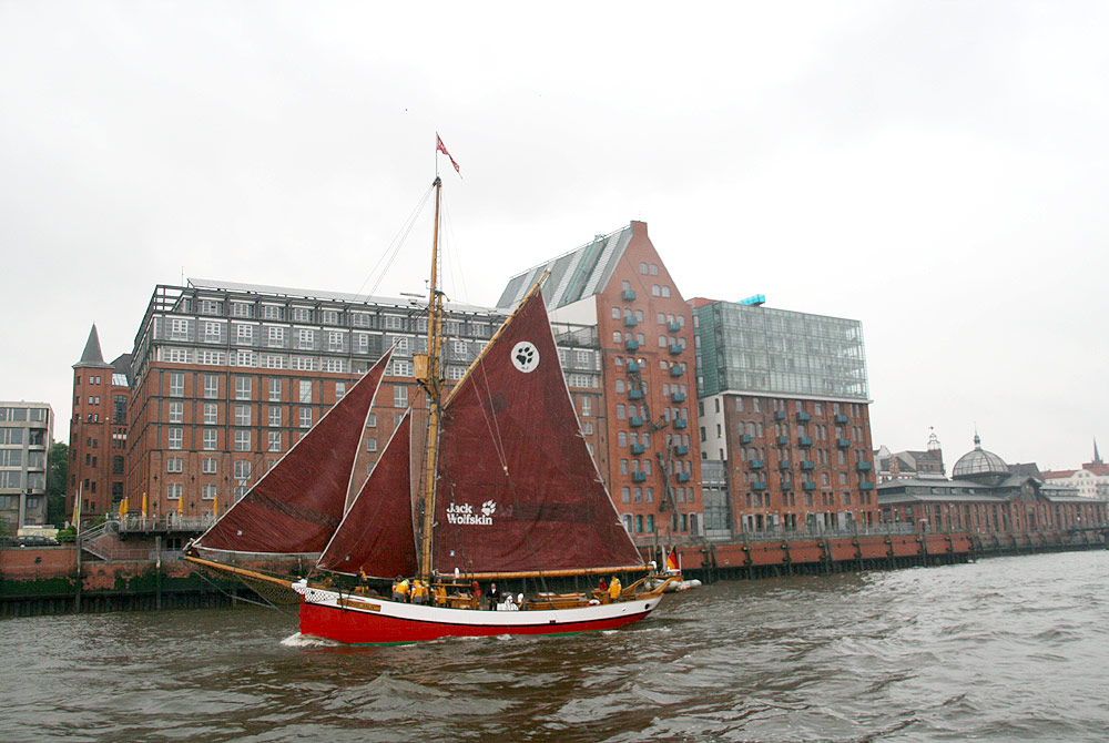 Mit Vollzeug vorbei am St. Pauli Fischmarkt und der GREENPEACE-Europa-Zentrale (links oben die 3 silbergrauen Stockwerke)