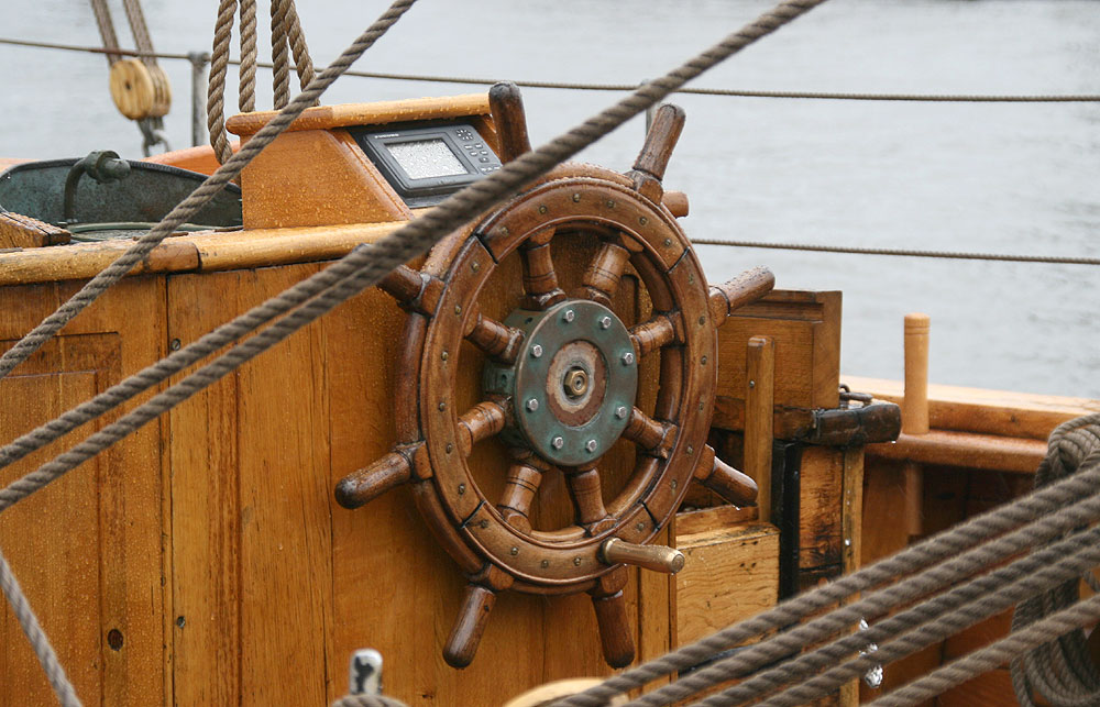 Historisches Ruder und hochmoderne Navigation - früher besaß die DAGMAR AAEN ein Ruderhaus...