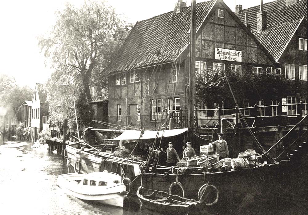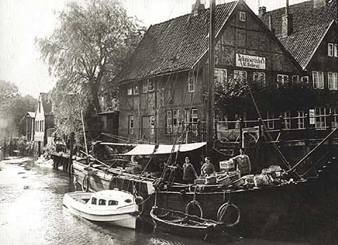 Fischkutter und kleine Frachtschiffe legten an der Störschleife in Itzehoe an und versorgten die Stadt mit Lebensmitteln. Dieser einmastige Ewer bringt frisches Obst und Gemüse aus den Hamburger Vierlanden (um 1928).