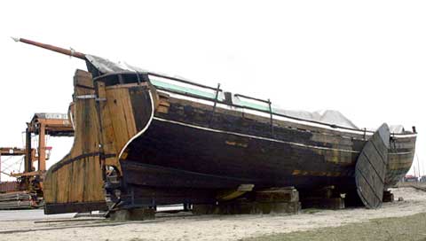 Hermanns Backbord - unter der Plane ragt der nach hinten abgekippte Großmast heraus