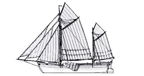 Die Gaffel-Takelung (Segelanschlag in Längsrichtung) eines zweimastigen Ewers, des Besan-Ewers