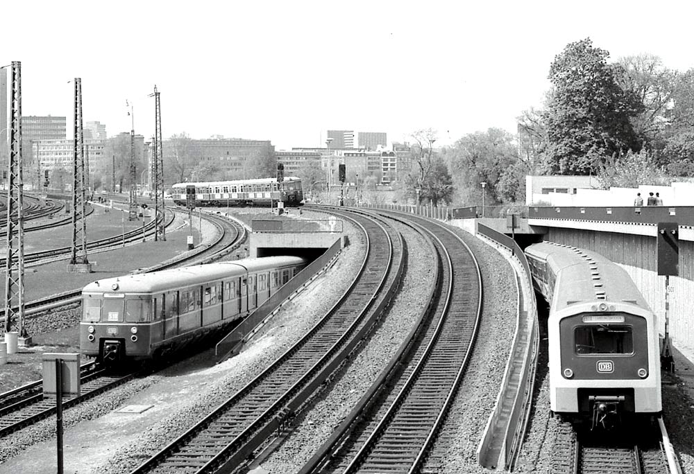 S-Bahnen am Nordkopf des Hauptbahnhofs, 1978: ganz links die Linie S1 ausfahrend aus dem City-Tunnel aus Richtung Wedel nach Ohlsdorf in der Mitte die Linie S21 aus Richtung Elbgaustraße nach Bergedorf /Aumühle und rechts die S1 einfahrend in den City-Tunnel in Richtung Wedel (Foto: DB AG)