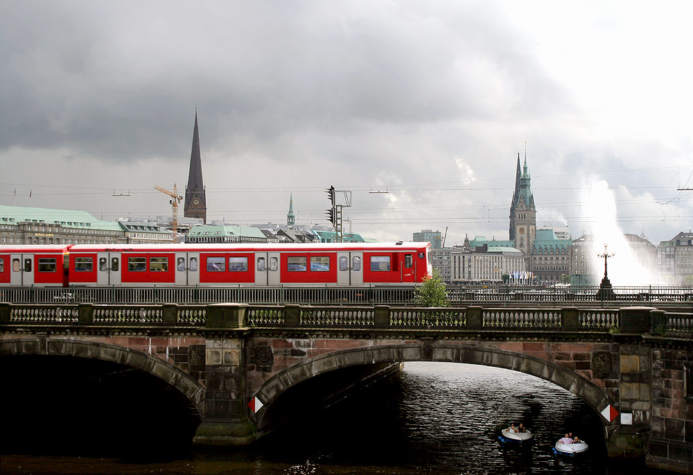 Triebwagen BR 472 auf der Lombarsbrücke vor der Alsterfontäne und dem Jungfernstieg
