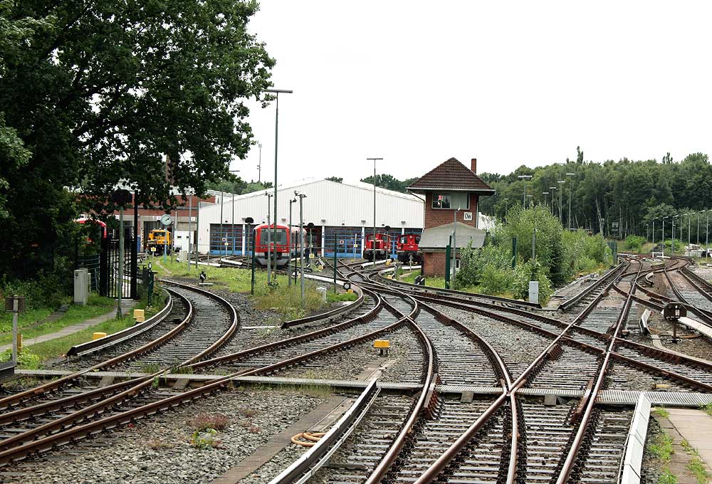 Ausfahrt Bahnhof Ohlsdorf mit den Streckengleisen Richtung Flughafen und Poppenbüttel. Deutlich zu erkennen sind die seitlichen Stromschienen für den Gleichstrombetrieb, die zwischen Links- und Rechtslage nach Bedarf wechseln