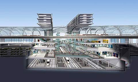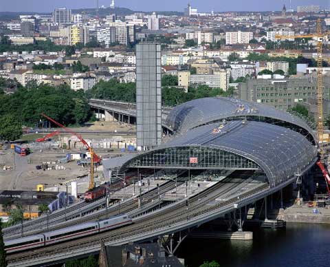 Die Bauzeit für dieses Dach betrug nur vier Monate. In dieser Zeit mußten alle 10 000 Schweißnähte gezogen und alle Seile gespannt werden. Die 40 bis 50 Tonnen schweren Dachbinder mußten mit einem insgesamt 3600 Tonnen schweren Montagegerüst gestützt werden. Die Gleise der Nord-Süd-Verbindung 15 Meter unter der Erde und die Gleise der Ost-West-Verbindung zehn Meter über dem Straßenniveau bilden den markanten Kreuzungsbahnhof. Eine halbe Million Kubikmeter Beton und 85 000 Tonnen Stahl für die Bewehrung des Betons wurden in den Rohbauten verbaut. Die 321 Meter lange gläserne Halle der in Ost-West-Richtung verlaufenden Stadtbahn wird von der in Nord-Süd-Richtung verlaufenden 160 Meter langen und 40 Meter breiten Bahnhofshalle gekreuzt. Damit wird architektonisch der vorgegebene Gleisverlauf unterstrichen. Ein raffiniert ausgetüfteltes System großer Öffnungen in den Decken aller Ebenen läßt Tageslicht bis zu den unteren Gleisen gelangen. Die zwei 46 Meter hohen Bürogebäude, die so genannten Bügelbauten, überspannen außerdem die Stadtbahn und bilden den weithin sichtbaren Rahmen für diesen einzigartigen Verkehrsknotenpunkt.