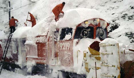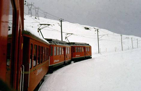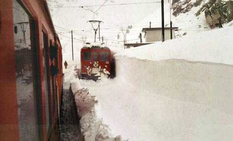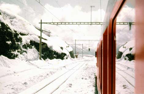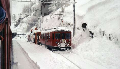 Wenn es im Hochgebirge so richtig schneit und es dazu noch Sturm hat, kann eine Fahrt durch mehrfache Unterbrechungen wesentlich länger dauern. Dann merkt auch der Tourist, daß Sicherheit und Aufrechterhaltung des Bahnbetriebs kein Spaß ist, sondern für das Bahnpersonal viel Mühe und sehr hohen Arbeitseinsatz bedeutet.