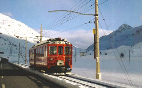 Bei prächtigem Winterwetter vorbei an bis zu 30 cm im Durchmesser dicken Fahrleitungsmasten fährt der ABe 4/4 42 in Richtung Diavolezza. Im Hintergrund links der Fuß des pyramidenförmigen Piz Lagalb und rechts die Station Lagalb. Das im Hintergrund rechts aufragende Massiv ist der 3031 m hohe Sassal Mason, der am rechten Seeufer des Lago Bianco ansteigt.